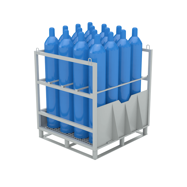 Паллета предназначена для транспортировки, хранения, а также проведения механизированных погрузочно-разгрузочных работ при использовании кислородных, ацетиленовых, углекислотных или аналогичных по типоразмеру баллонов. Вместимость - 16 баллонов (объемом 40л, макс. Ø219 мм).
